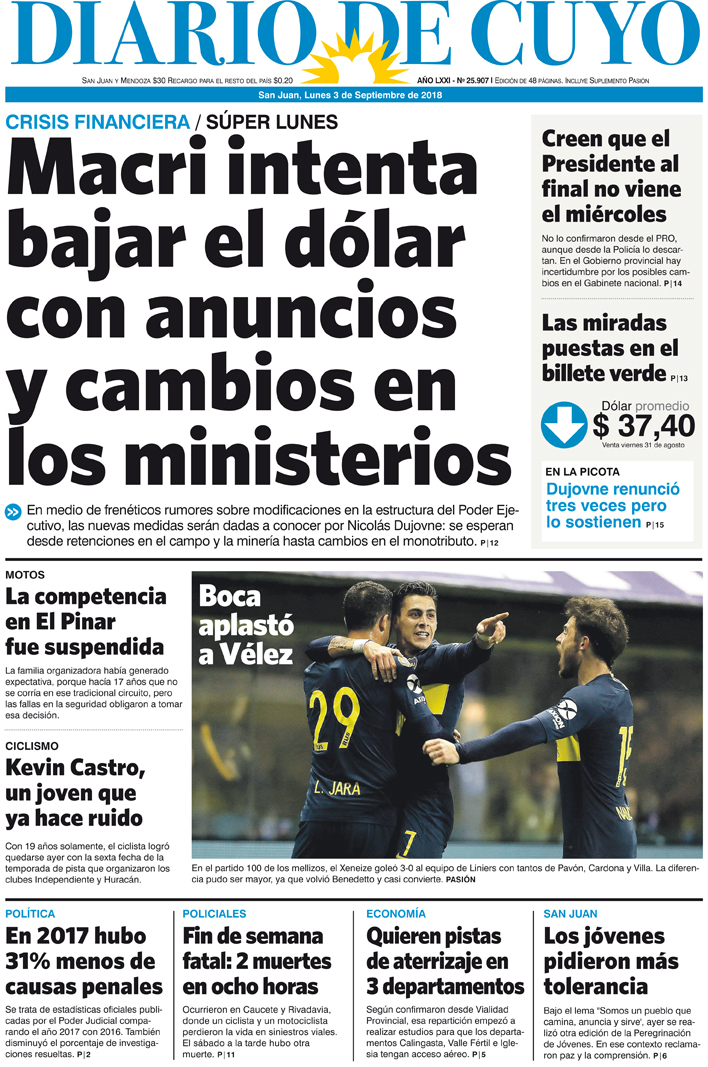 Diario de Cuyo | HOME | Noticias | Tapa Edición Tapa Edición 03 de Septiembre de 2018 Por Redacción Diario de Cuyo 02/09/2018 · 0:00 Escuchar la noticia Escuchar la noticia Your browser doesn’t support HTML5 audio Tapa Edición Ver los comentarios ›