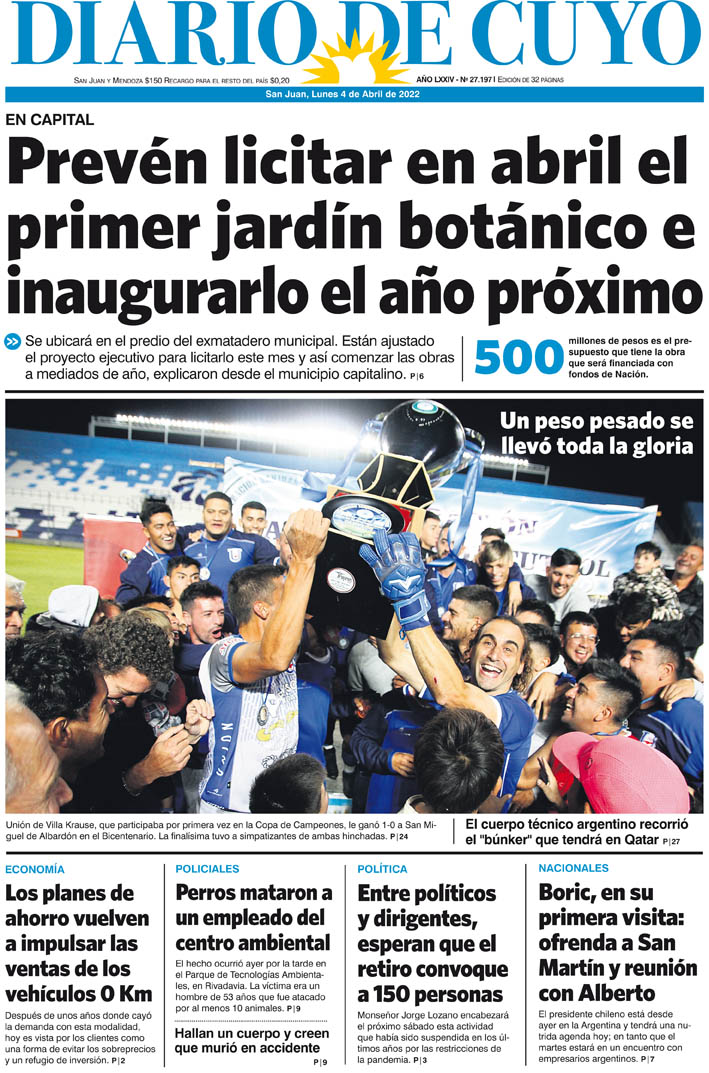 Diario de Cuyo | HOME | Noticias Tapa Edición 04 de Abril del 2022 Por Redacción Diario de Cuyo 03/04/2022 · 0:00 Escuchar la noticia Escuchar la noticia Your browser doesn’t support HTML5 audio Ver los comentarios ›