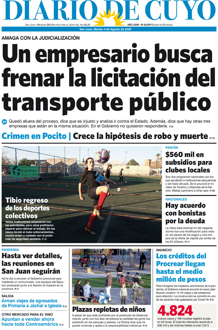 Diario de Cuyo | HOME | Noticias Tapa Edición 04 de Agosto del 2020 Por Redacción Diario de Cuyo 03/08/2020 · 0:00 Escuchar la noticia Escuchar la noticia Your browser doesn’t support HTML5 audio Ver los comentarios ›