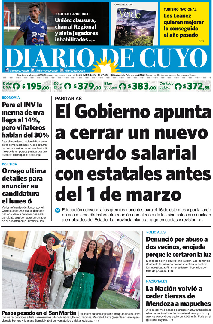 Diario de Cuyo | HOME | Noticias Tapa Edición 04 de Febrero del 2023 Por Redacción Diario de Cuyo 03/02/2023 · 0:00 Escuchar la noticia Escuchar la noticia Your browser doesn’t support HTML5 audio Ver los comentarios ›