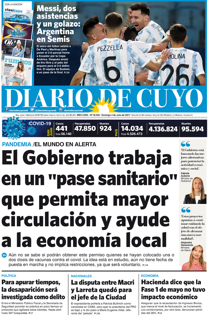 Diario de Cuyo | HOME | Noticias Tapa Edición 04 de Julio del 2021 Por Redacción Diario de Cuyo 04/07/2021 · 0:00 Escuchar la noticia Escuchar la noticia Your browser doesn’t support HTML5 audio Ver los comentarios ›
