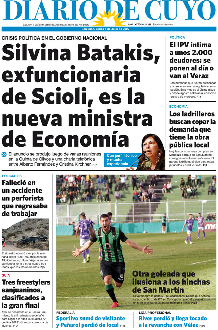 Diario de Cuyo | HOME | Noticias Tapa Edición 04 de Julio del 2022 Por Redacción Diario de Cuyo 04/07/2022 · 0:00 Escuchar la noticia Escuchar la noticia Your browser doesn’t support HTML5 audio Ver los comentarios ›