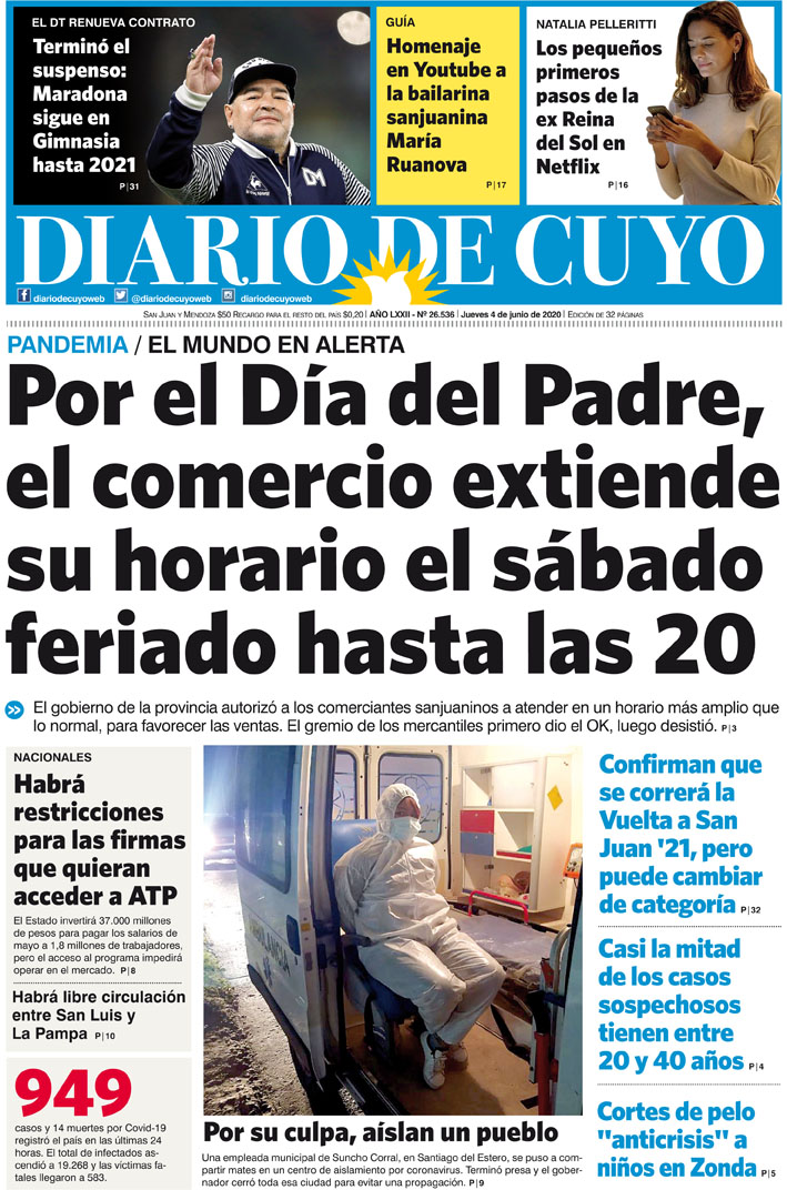 Diario de Cuyo | HOME | Noticias Tapa Edición 04 de Junio del 2020 Por Redacción Diario de Cuyo 03/06/2020 · 0:00 Escuchar la noticia Escuchar la noticia Your browser doesn’t support HTML5 audio Ver los comentarios ›