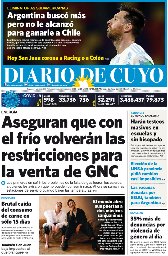 Diario de Cuyo | HOME | Noticias Tapa Edición 04 de Junio del 2021 Por Redacción Diario de Cuyo 04/06/2021 · 0:00 Escuchar la noticia Escuchar la noticia Your browser doesn’t support HTML5 audio Ver los comentarios ›