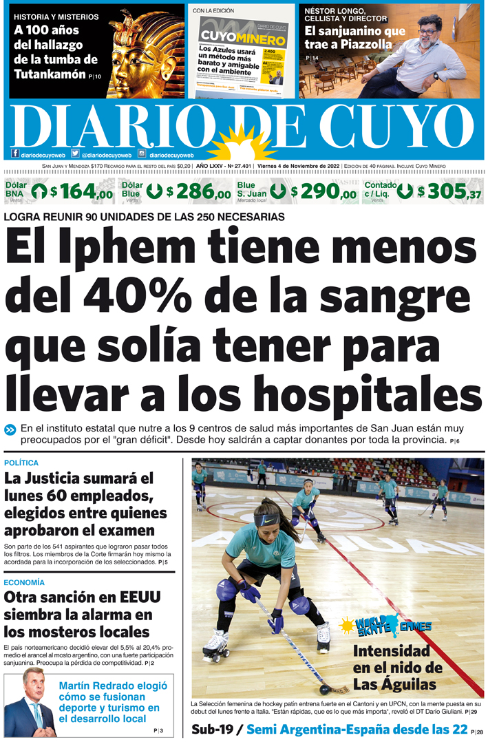 Diario de Cuyo | HOME | Noticias Tapa Edición 04 de Noviembre del 2022 Por Redacción Diario de Cuyo 03/11/2022 · 0:00 Escuchar la noticia Escuchar la noticia Your browser doesn’t support HTML5 audio Ver los comentarios ›
