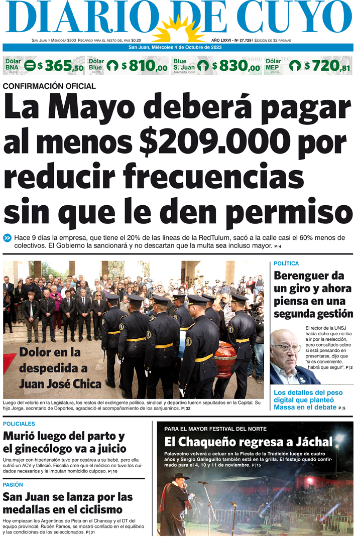 Diario de Cuyo | HOME | Noticias Tapa Edición 04 de Octubre del 2023 Por Redacción Diario de Cuyo 03/10/2023 · 0:00 Escuchar la noticia Escuchar la noticia Your browser doesn’t support HTML5 audio Ver los comentarios ›