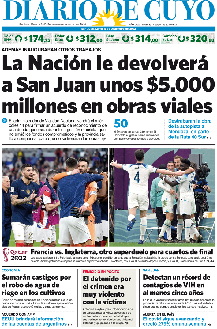 Diario de Cuyo | HOME | Noticias Tapa Edición 05 de Diciembre del 2022 Por Redacción Diario de Cuyo 04/12/2022 · 0:00 Escuchar la noticia Escuchar la noticia Your browser doesn’t support HTML5 audio Ver los comentarios ›