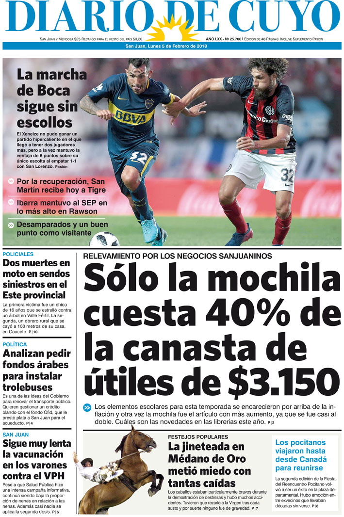 Diario de Cuyo | HOME | Noticias | Tapa Edición Tapa Edición 05 de Febrero del 2018 Por Redacción Diario de Cuyo 04/02/2018 · 0:00 Escuchar la noticia Escuchar la noticia Your browser doesn’t support HTML5 audio Tapa Edición Ver los comentarios ›