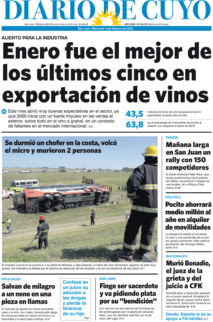 Diario de Cuyo | HOME | Noticias Tapa Edicion 05 de Febrero del 2020 Por Redacción Diario de Cuyo 04/02/2020 · 0:00 Escuchar la noticia Escuchar la noticia Your browser doesn’t support HTML5 audio Ver los comentarios ›