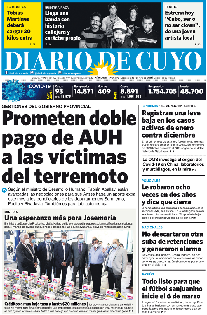 Diario de Cuyo | HOME | Noticias Tapa Edición 05 de Febrero del 2021 Por Redacción Diario de Cuyo 04/02/2021 · 0:00 Escuchar la noticia Escuchar la noticia Your browser doesn’t support HTML5 audio Ver los comentarios ›