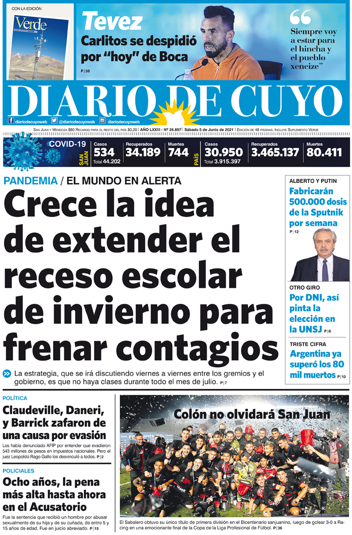 Diario de Cuyo | HOME | Noticias Tapa Edición 05 de Junio del 2021 Por Redacción Diario de Cuyo 05/06/2021 · 0:00 Escuchar la noticia Escuchar la noticia Your browser doesn’t support HTML5 audio Ver los comentarios ›