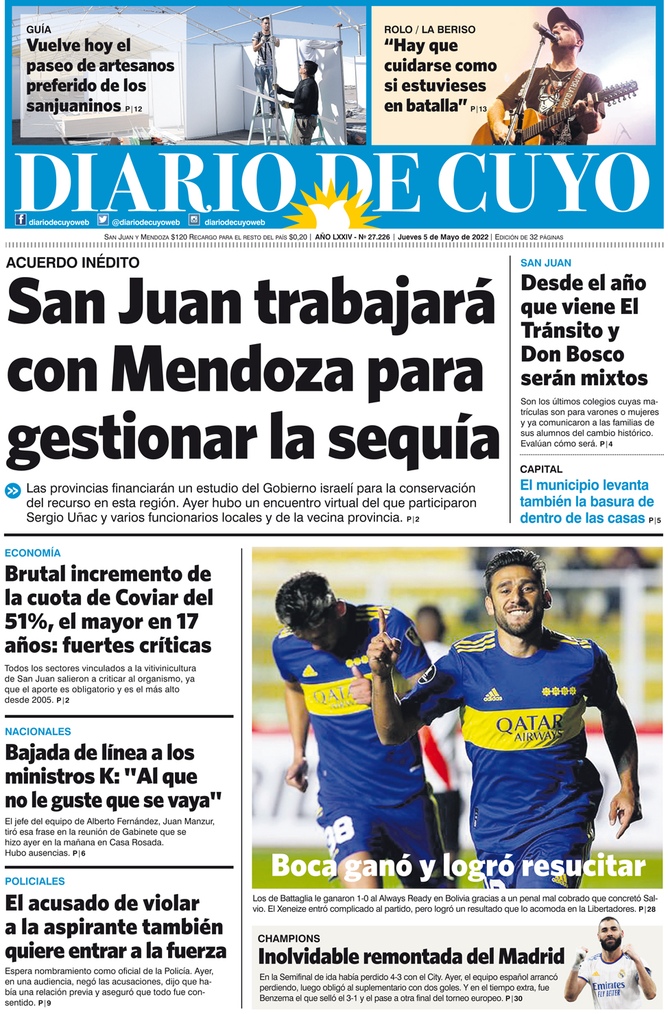 Diario de Cuyo | HOME | Noticias Tapa Edición 05 de Mayo del 2022 Por Redacción Diario de Cuyo 04/05/2022 · 0:00 Escuchar la noticia Escuchar la noticia Your browser doesn’t support HTML5 audio Ver los comentarios ›