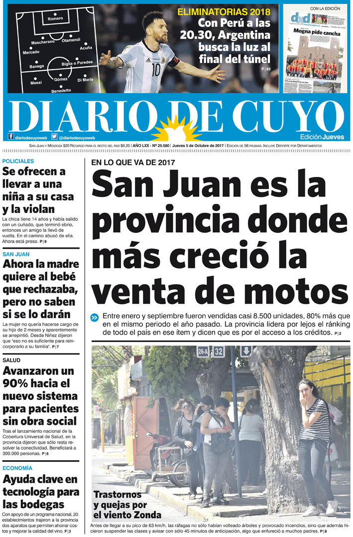 Diario de Cuyo | HOME | Noticias Tapa Edición 05 de Octubre de 2017 Por Redacción Diario de Cuyo 04/10/2017 · 0:00 Escuchar la noticia Escuchar la noticia Your browser doesn’t support HTML5 audio Ver los comentarios ›