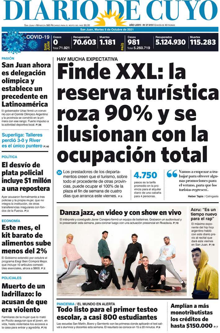Diario de Cuyo | HOME | Noticias Tapa Edición 05 de Octubre del 2021 Por Redacción Diario de Cuyo 04/10/2021 · 0:00 Escuchar la noticia Escuchar la noticia Your browser doesn’t support HTML5 audio Ver los comentarios ›