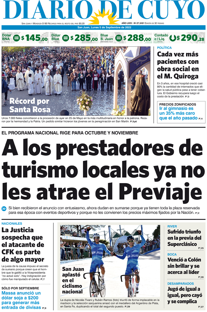 Diario de Cuyo | HOME | Noticias Tapa Edición 05 de Septiembre del 2022 Por Redacción Diario de Cuyo 05/09/2022 · 0:00 Escuchar la noticia Escuchar la noticia Your browser doesn’t support HTML5 audio Ver los comentarios ›