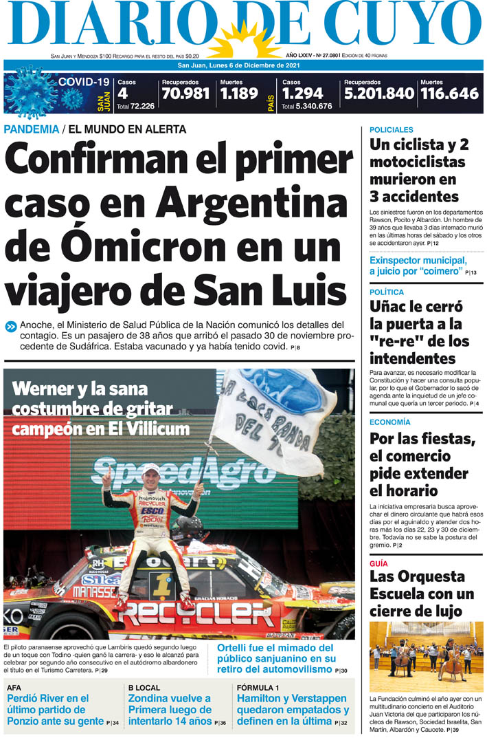 Diario de Cuyo | HOME | Noticias Tapa Edición 06 de Diciembre del 2021 Por Redacción Diario de Cuyo 06/12/2021 · 0:00 Escuchar la noticia Escuchar la noticia Your browser doesn’t support HTML5 audio Ver los comentarios ›
