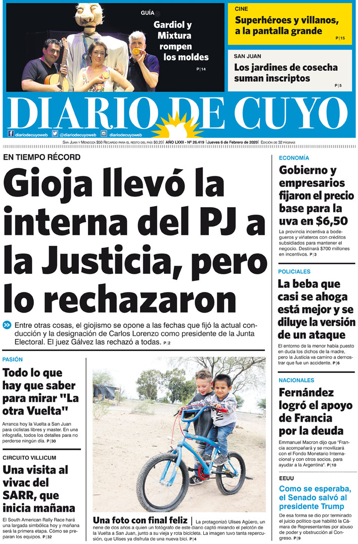 Diario de Cuyo | HOME | Noticias | Tapa Edición Tapa Edición 06 de Febrero del 2020 Por Redacción Diario de Cuyo 05/02/2020 · 0:00 Escuchar la noticia Escuchar la noticia Your browser doesn’t support HTML5 audio Tapa Edición Ver los comentarios ›