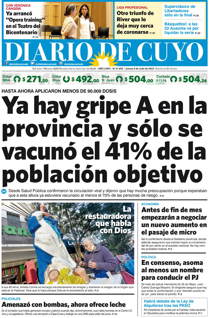 Diario de Cuyo | HOME | Noticias Tapa Edición 06 de Julio del 2023 Por Redacción Diario de Cuyo 06/07/2023 · 0:00 Escuchar la noticia Escuchar la noticia Your browser doesn’t support HTML5 audio Ver los comentarios ›