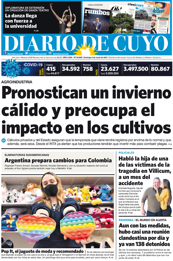 Diario de Cuyo | HOME | Noticias Tapa Edición 06 de Junio del 2021 Por Redacción Diario de Cuyo 05/06/2021 · 0:00 Escuchar la noticia Escuchar la noticia Your browser doesn’t support HTML5 audio Ver los comentarios ›