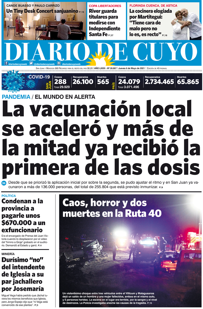 Diario de Cuyo | HOME | Noticias Tapa Edición 06 de Mayo del 2021 Por Redacción Diario de Cuyo 06/05/2021 · 0:00 Escuchar la noticia Escuchar la noticia Your browser doesn’t support HTML5 audio Ver los comentarios ›