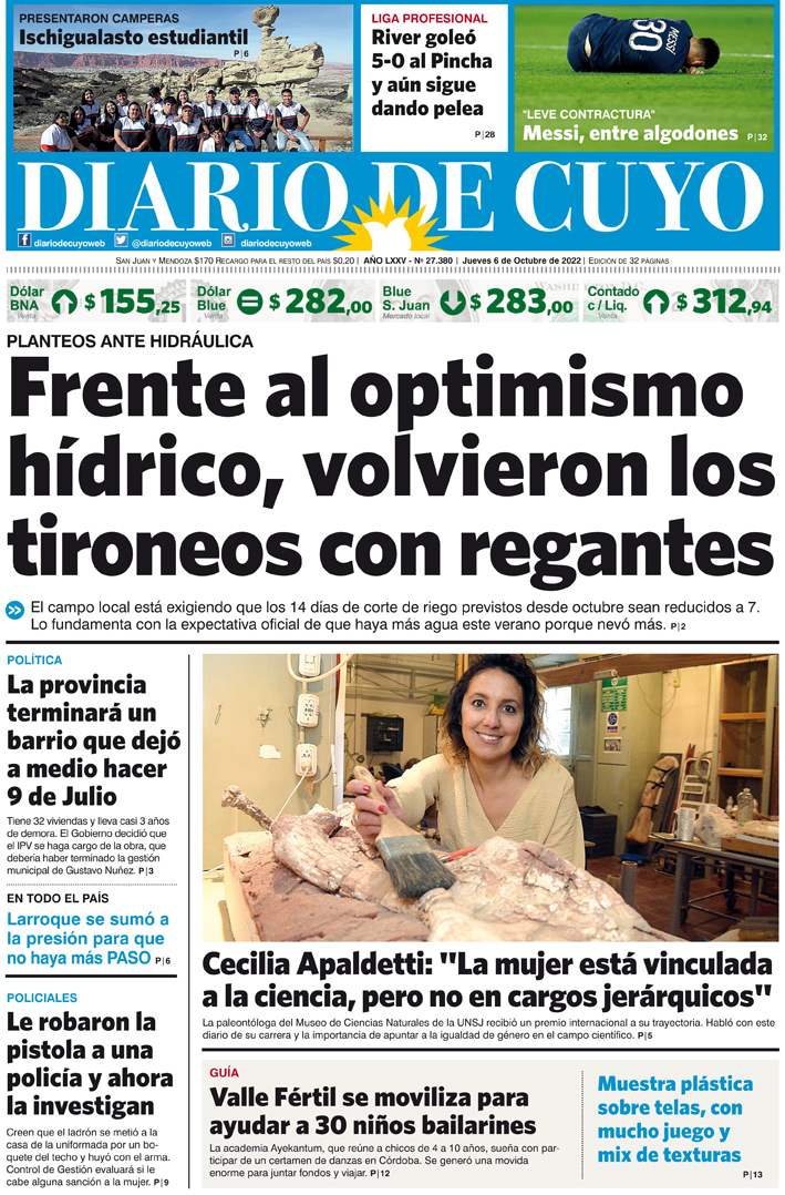 Diario de Cuyo | HOME | Noticias Tapa Edición 06 de Octubre del 2022 Por Redacción Diario de Cuyo 06/10/2022 · 0:00 Escuchar la noticia Escuchar la noticia Your browser doesn’t support HTML5 audio Ver los comentarios ›