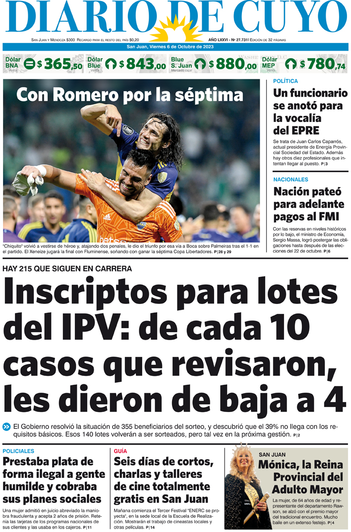 Diario de Cuyo | HOME | Noticias Tapa Edición 06 de Octubre del 2023 Por Redacción Diario de Cuyo 06/10/2023 · 0:00 Escuchar la noticia Escuchar la noticia Your browser doesn’t support HTML5 audio Ver los comentarios ›