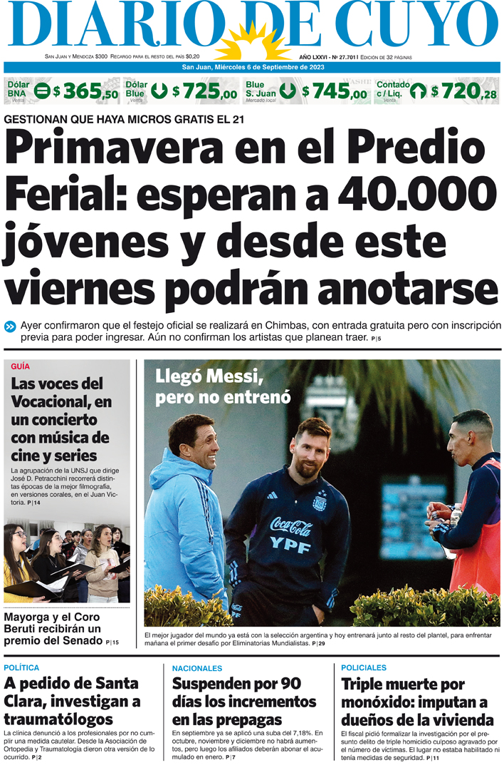 Diario de Cuyo | HOME | Noticias Tapa Edición 06 de Septiembre del 2023 Por Redacción Diario de Cuyo 05/09/2023 · 0:00 Escuchar la noticia Escuchar la noticia Your browser doesn’t support HTML5 audio Ver los comentarios ›