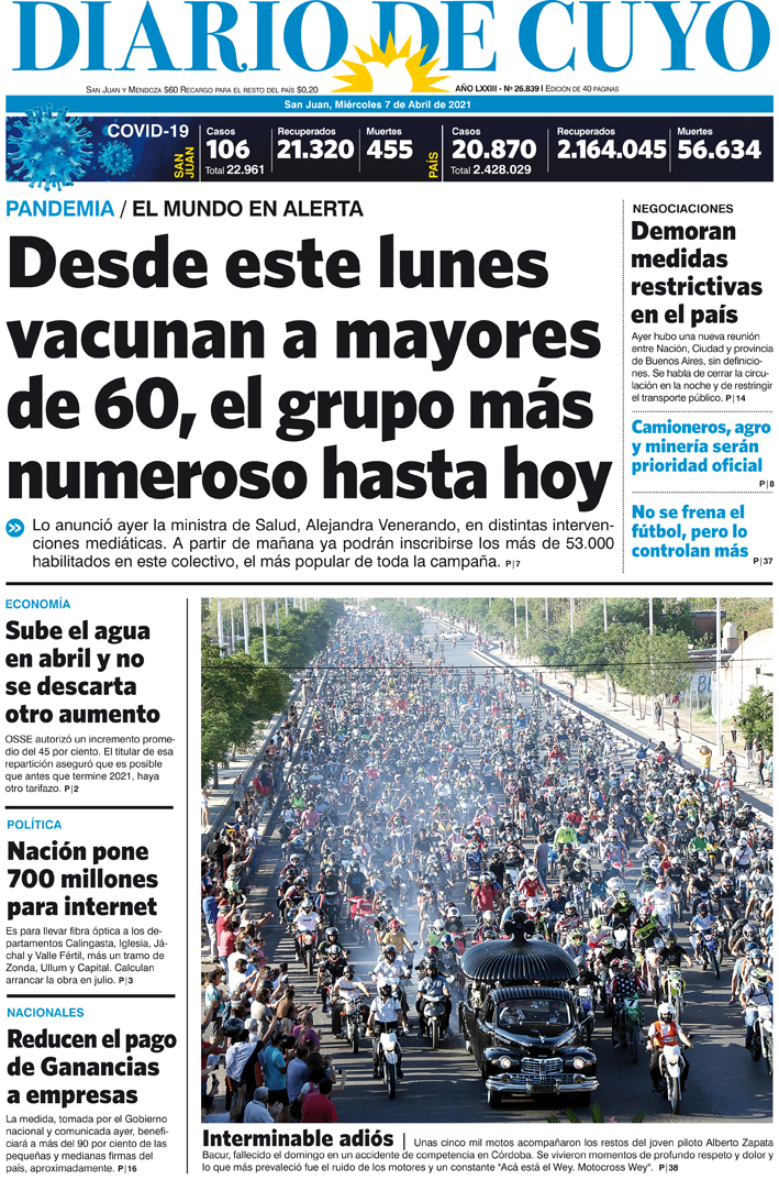 Diario de Cuyo | HOME | Noticias Tapa Edición 07 de Abril del 2021 Por Redacción Diario de Cuyo 06/04/2021 · 0:00 Escuchar la noticia Escuchar la noticia Your browser doesn’t support HTML5 audio Ver los comentarios ›