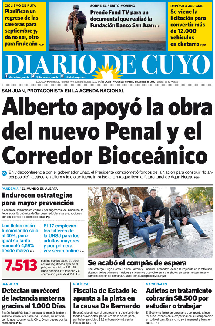 Diario de Cuyo | HOME | Noticias Tapa Edición 07 de Agosto del 2020 Por Redacción Diario de Cuyo 06/08/2020 · 0:00 Escuchar la noticia Escuchar la noticia Your browser doesn’t support HTML5 audio Ver los comentarios ›