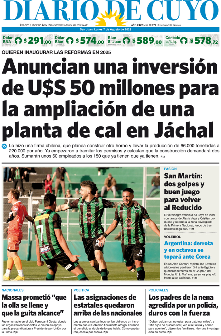 Diario de Cuyo | HOME | Noticias Tapa Edición 07 de Agosto del 2023 Por Redacción Diario de Cuyo 07/08/2023 · 0:00 Escuchar la noticia Escuchar la noticia Your browser doesn’t support HTML5 audio Ver los comentarios ›
