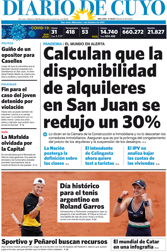 Diario de Cuyo | HOME | Noticias Tapa Edición 07 de Octubre del 2020 Por Redacción Diario de Cuyo 06/10/2020 · 0:00 Escuchar la noticia Escuchar la noticia Your browser doesn’t support HTML5 audio Ver los comentarios ›