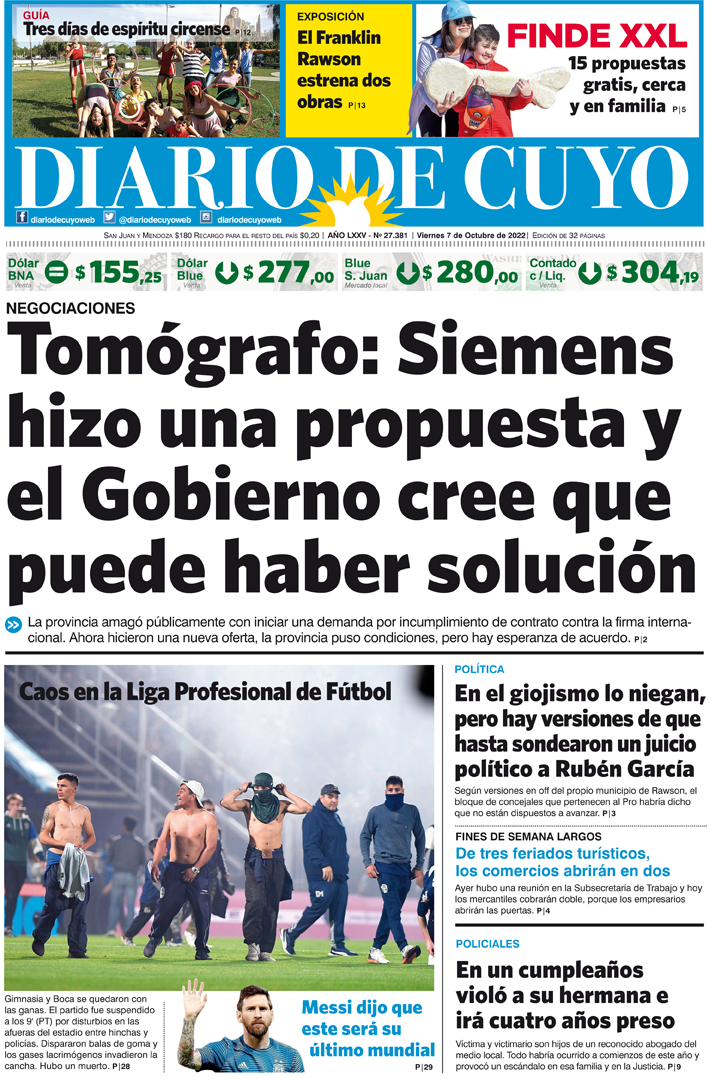 Diario de Cuyo | HOME | Noticias Tapa Edición 07 de Octubre del 2022 Por Redacción Diario de Cuyo 06/10/2022 · 0:00 Escuchar la noticia Escuchar la noticia Your browser doesn’t support HTML5 audio Ver los comentarios ›