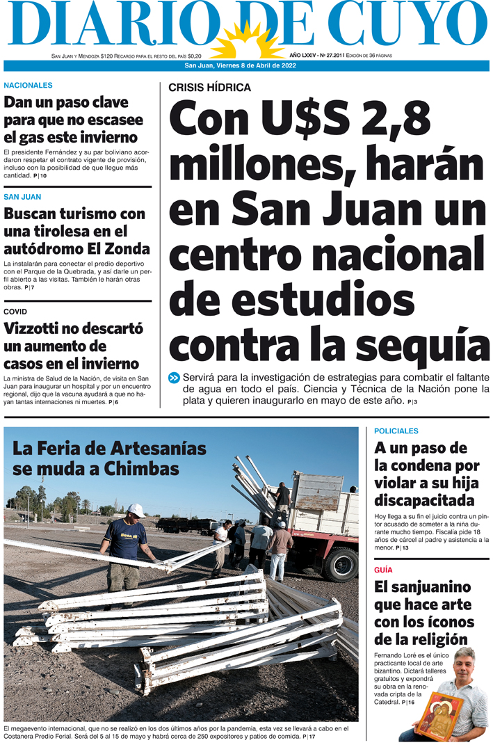 Diario de Cuyo | HOME | Noticias Tapa Edición 08 de Abril del 2022 Por Redacción Diario de Cuyo 08/04/2022 · 0:00 Escuchar la noticia Escuchar la noticia Your browser doesn’t support HTML5 audio Ver los comentarios ›