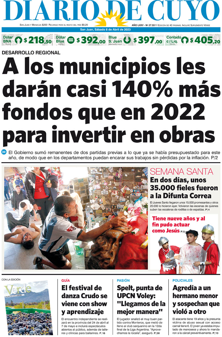 Diario de Cuyo | HOME | Noticias Tapa Edición 08 de Abril del 2023 Por Redacción Diario de Cuyo 07/04/2023 · 0:00 Escuchar la noticia Escuchar la noticia Your browser doesn’t support HTML5 audio Ver los comentarios ›