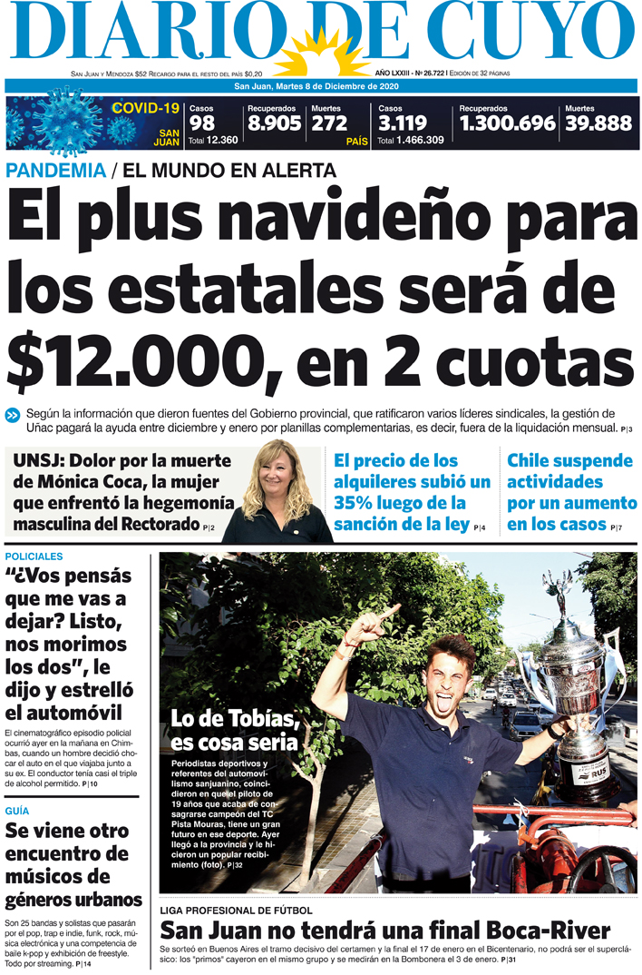 Diario de Cuyo | HOME | Noticias Tapa Edición 08 de Diciembre del 2020 Por Redacción Diario de Cuyo 07/12/2020 · 0:00 Escuchar la noticia Escuchar la noticia Your browser doesn’t support HTML5 audio Ver los comentarios ›