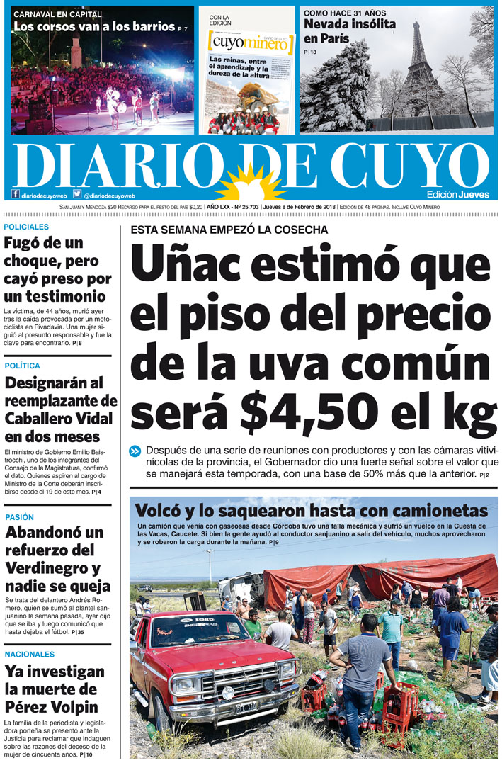 Diario de Cuyo | HOME | Noticias | Tapa Edición Tapa Edición 08 de Febrero del 2018 Por Redacción Diario de Cuyo 07/02/2018 · 0:00 Escuchar la noticia Escuchar la noticia Your browser doesn’t support HTML5 audio Tapa Edición Ver los comentarios ›