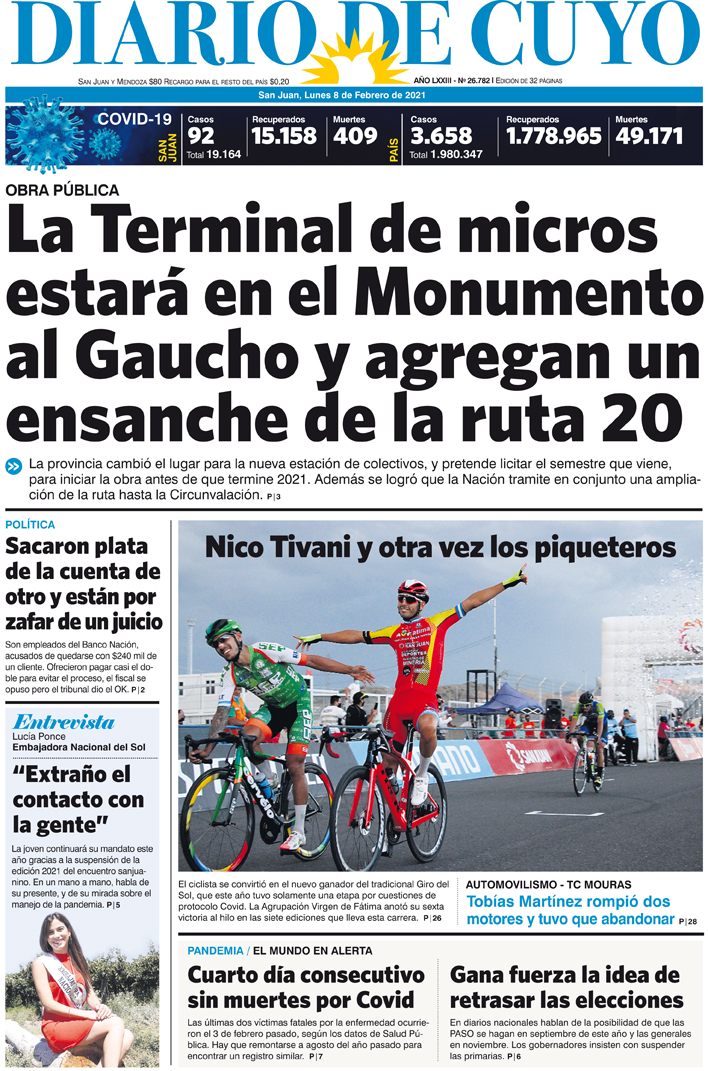 Diario de Cuyo | HOME | Noticias Tapa Edición 08 de Febrero del 2021 Por Redacción Diario de Cuyo 07/02/2021 · 0:00 Escuchar la noticia Escuchar la noticia Your browser doesn’t support HTML5 audio Ver los comentarios ›