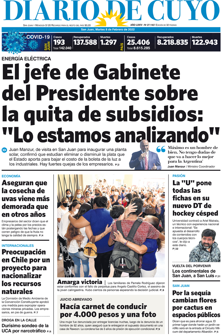 Diario de Cuyo | HOME | Noticias Tapa Edición 08 de Febrero del 2022 Por Redacción Diario de Cuyo 07/02/2022 · 0:00 Escuchar la noticia Escuchar la noticia Your browser doesn’t support HTML5 audio Ver los comentarios ›