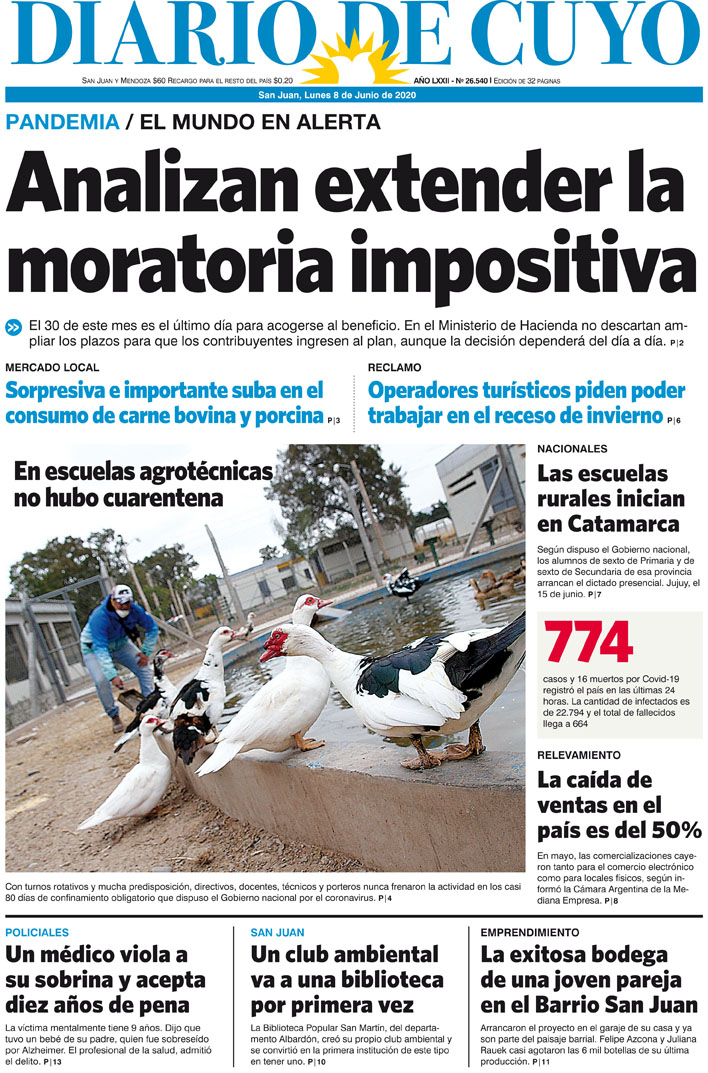 Diario de Cuyo | HOME | Noticias Tapa Edición 08 de Junio del 2020 Por Redacción Diario de Cuyo 07/06/2020 · 0:00 Escuchar la noticia Escuchar la noticia Your browser doesn’t support HTML5 audio Ver los comentarios ›