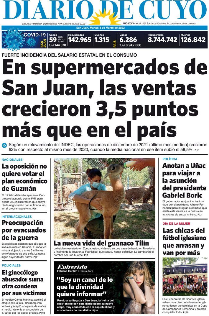 Diario de Cuyo | HOME | Noticias Tapa Edición 08 de Marzo del 2022 Por Redacción Diario de Cuyo 07/03/2022 · 0:00 Escuchar la noticia Escuchar la noticia Your browser doesn’t support HTML5 audio Ver los comentarios ›