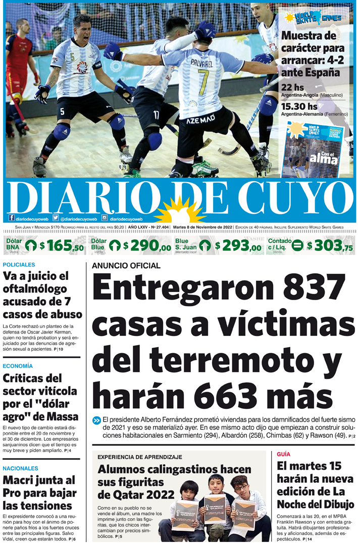 Diario de Cuyo | HOME | Noticias Tapa Edición 08 de Noviembre del 2022 Por Redacción Diario de Cuyo 08/11/2022 · 0:00 Escuchar la noticia Escuchar la noticia Your browser doesn’t support HTML5 audio Ver los comentarios ›