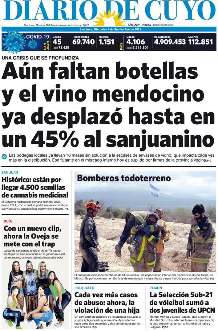 Diario de Cuyo | HOME | Noticias Tapa Edición 08 de Septiembre del 2021 Por Redacción Diario de Cuyo 07/09/2021 · 0:00 Escuchar la noticia Escuchar la noticia Your browser doesn’t support HTML5 audio Ver los comentarios ›