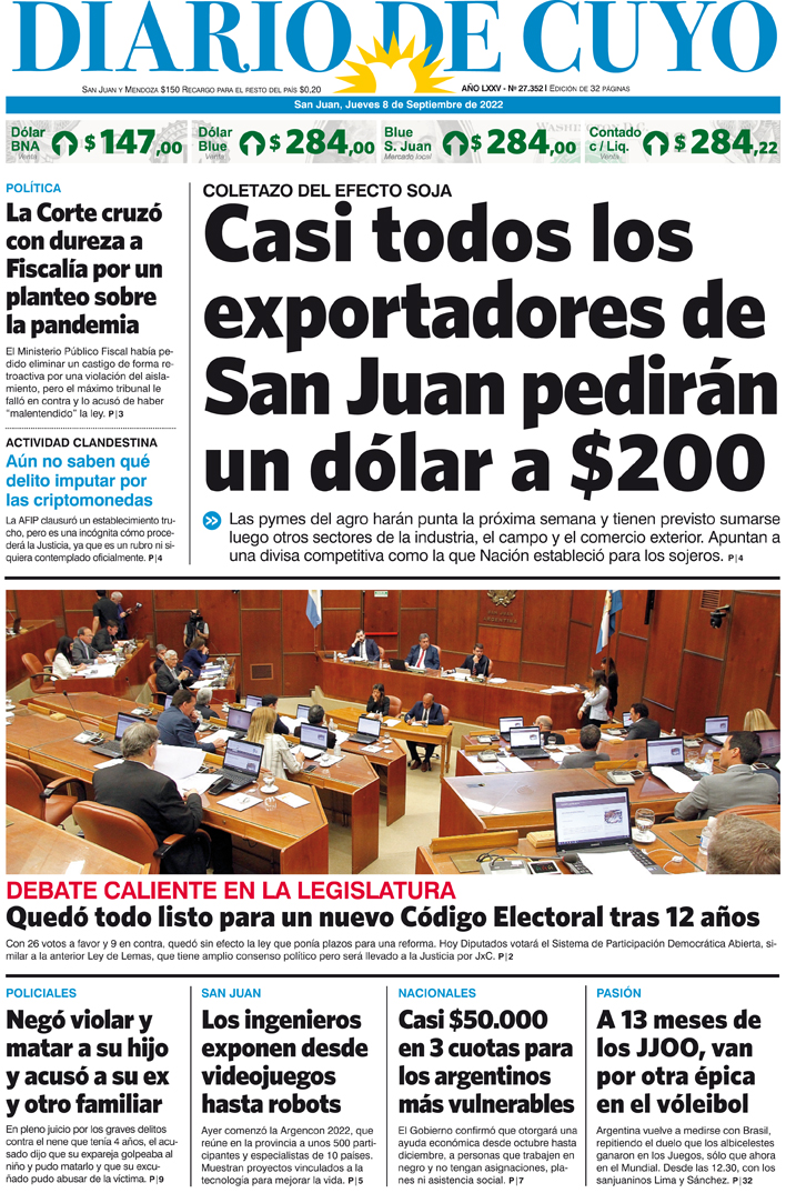 Diario de Cuyo | HOME | Noticias Tapa Edición 08 de Septiembre del 2022 Por Redacción Diario de Cuyo 07/09/2022 · 0:00 Escuchar la noticia Escuchar la noticia Your browser doesn’t support HTML5 audio Ver los comentarios ›