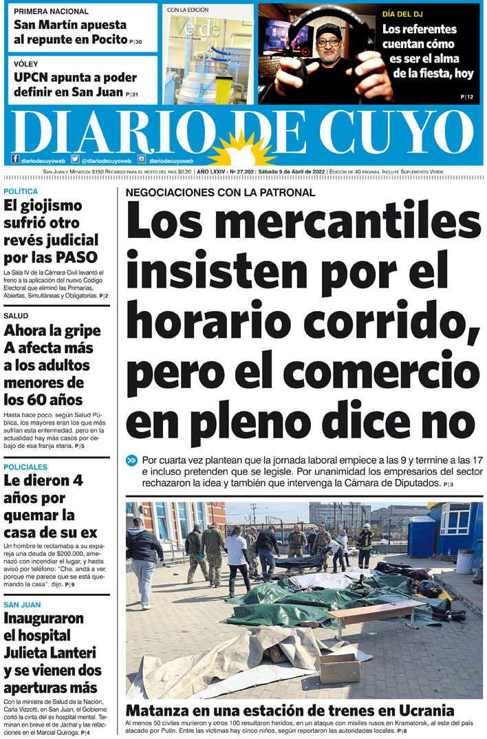 Diario de Cuyo | HOME | Noticias Tapa Edición 09 de Abril del 2022 Por Redacción Diario de Cuyo 09/04/2022 · 0:00 Escuchar la noticia Escuchar la noticia Your browser doesn’t support HTML5 audio Ver los comentarios ›