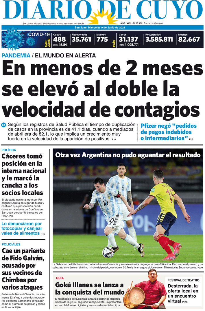 Diario de Cuyo | HOME | Noticias Tapa Edición 09 de Junio del 2021 Por Redacción Diario de Cuyo 08/06/2021 · 0:00 Escuchar la noticia Escuchar la noticia Your browser doesn’t support HTML5 audio Ver los comentarios ›