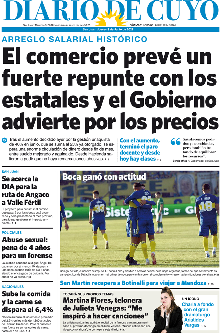Diario de Cuyo | HOME | Noticias Tapa Edición 09 de Junio del 2022 Por Redacción Diario de Cuyo 08/06/2022 · 0:00 Escuchar la noticia Escuchar la noticia Your browser doesn’t support HTML5 audio Ver los comentarios ›