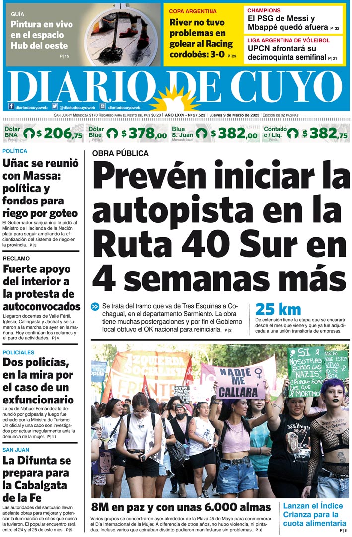 Diario de Cuyo | HOME | Noticias Tapa Edición 09 de Marzo del 2023 Por Redacción Diario de Cuyo 08/03/2023 · 0:00 Escuchar la noticia Escuchar la noticia Your browser doesn’t support HTML5 audio Ver los comentarios ›