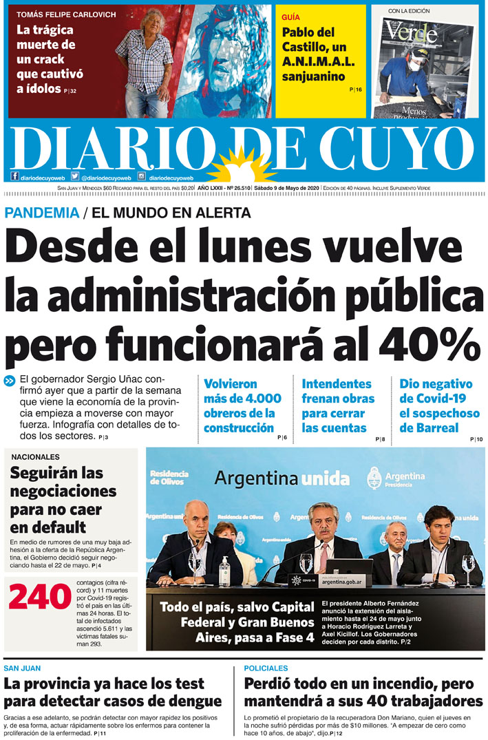 Diario de Cuyo | HOME | Noticias Tapa Edición 09 de Mayo del 2020 Por Redacción Diario de Cuyo 08/05/2020 · 0:00 Escuchar la noticia Escuchar la noticia Your browser doesn’t support HTML5 audio Ver los comentarios ›