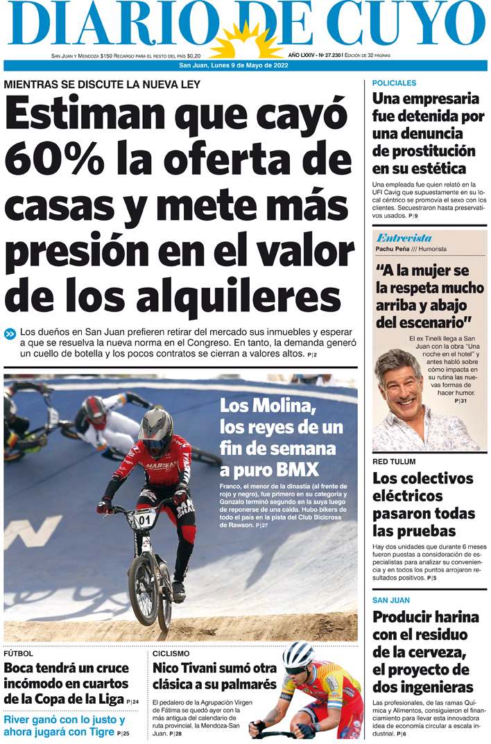 Diario de Cuyo | HOME | Noticias Tapa Edición 09 de Mayo del 2022 Por Redacción Diario de Cuyo 08/05/2022 · 0:00 Escuchar la noticia Escuchar la noticia Your browser doesn’t support HTML5 audio Ver los comentarios ›