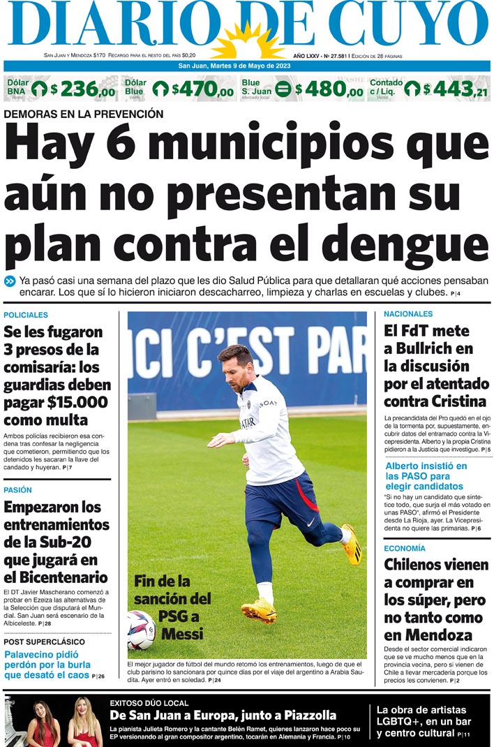 Diario de Cuyo | HOME | Noticias Tapa Edición 09 de Mayo del 2023 Por Redacción Diario de Cuyo 08/05/2023 · 0:00 Escuchar la noticia Escuchar la noticia Your browser doesn’t support HTML5 audio Ver los comentarios ›